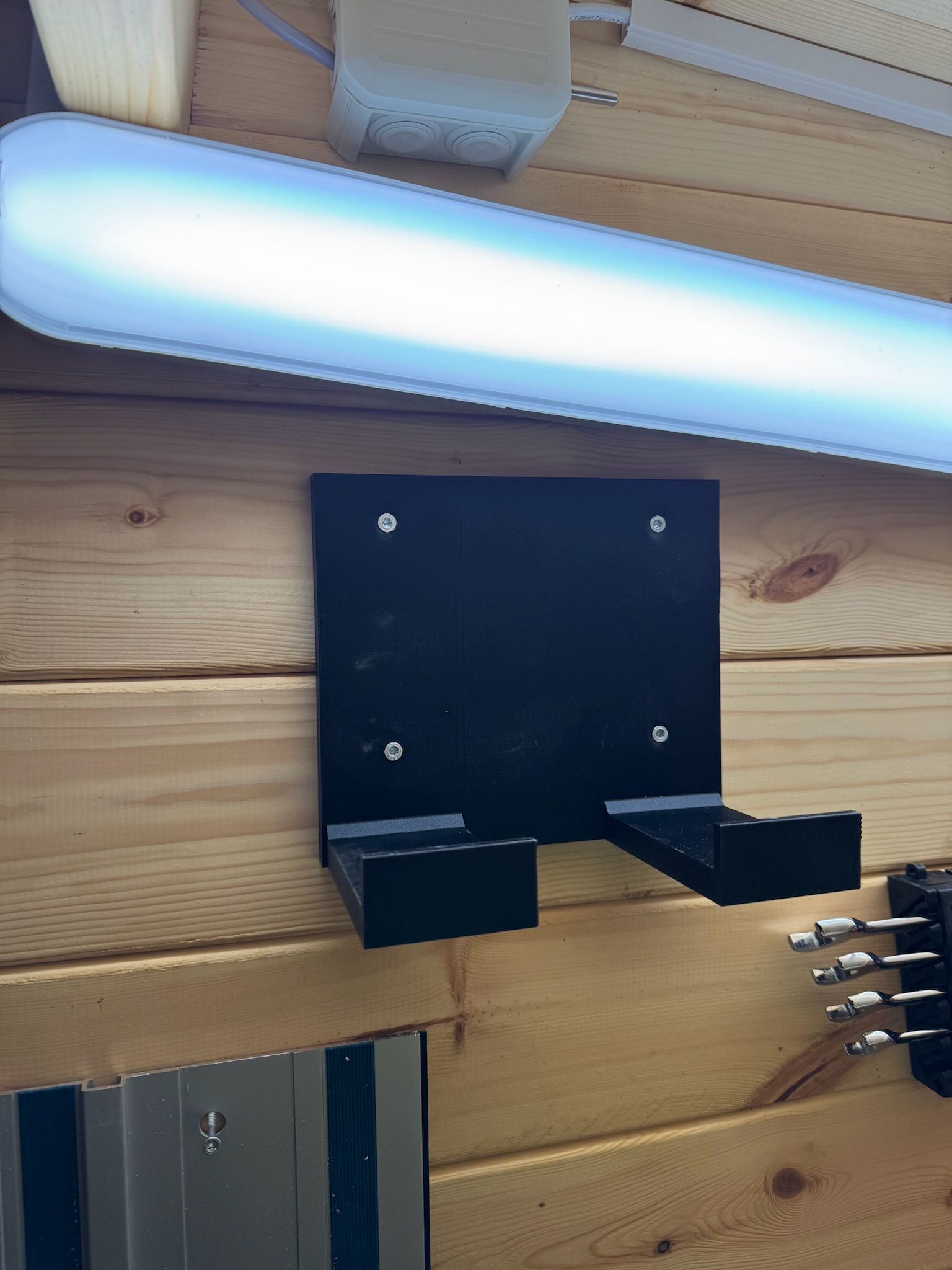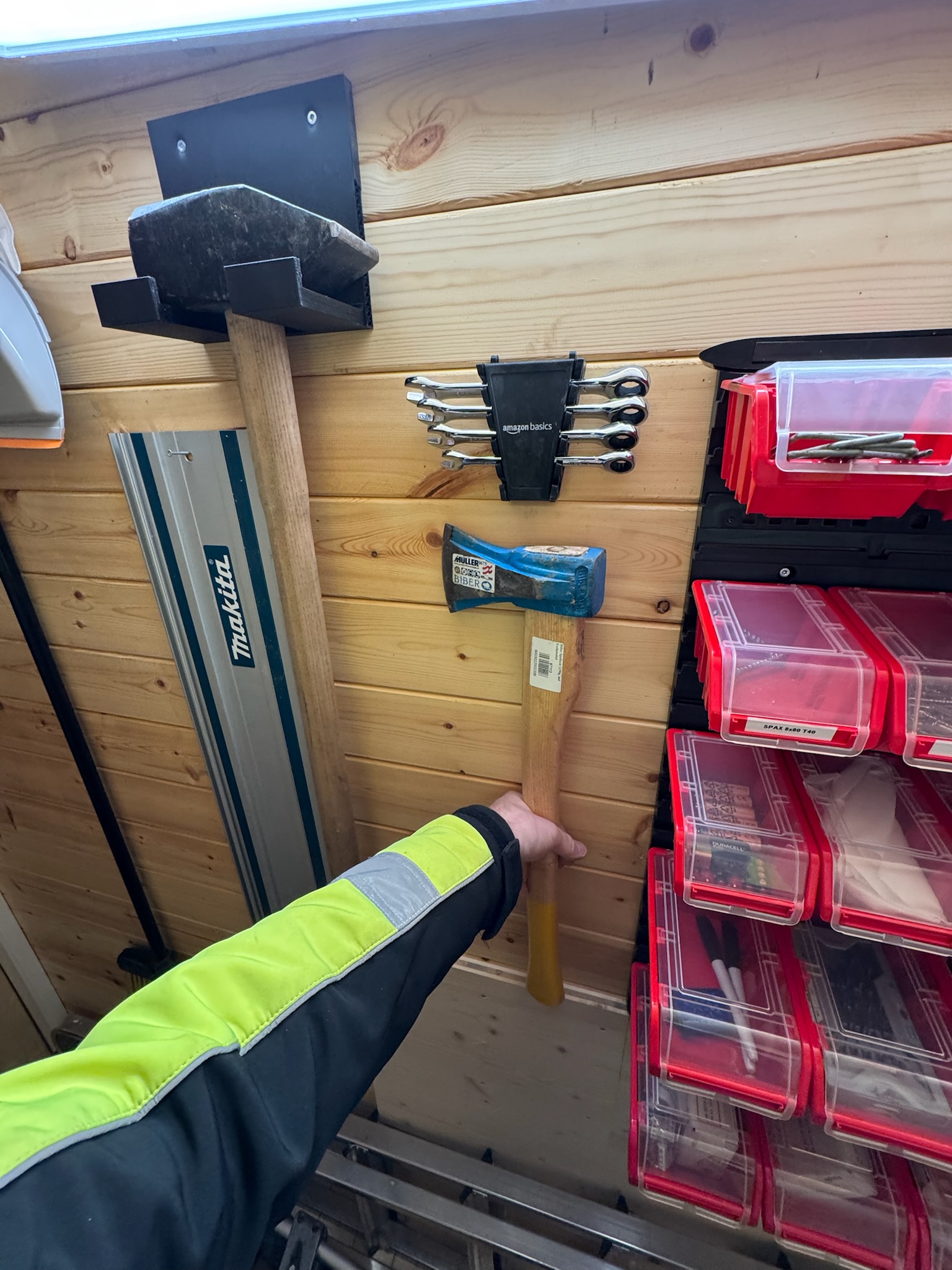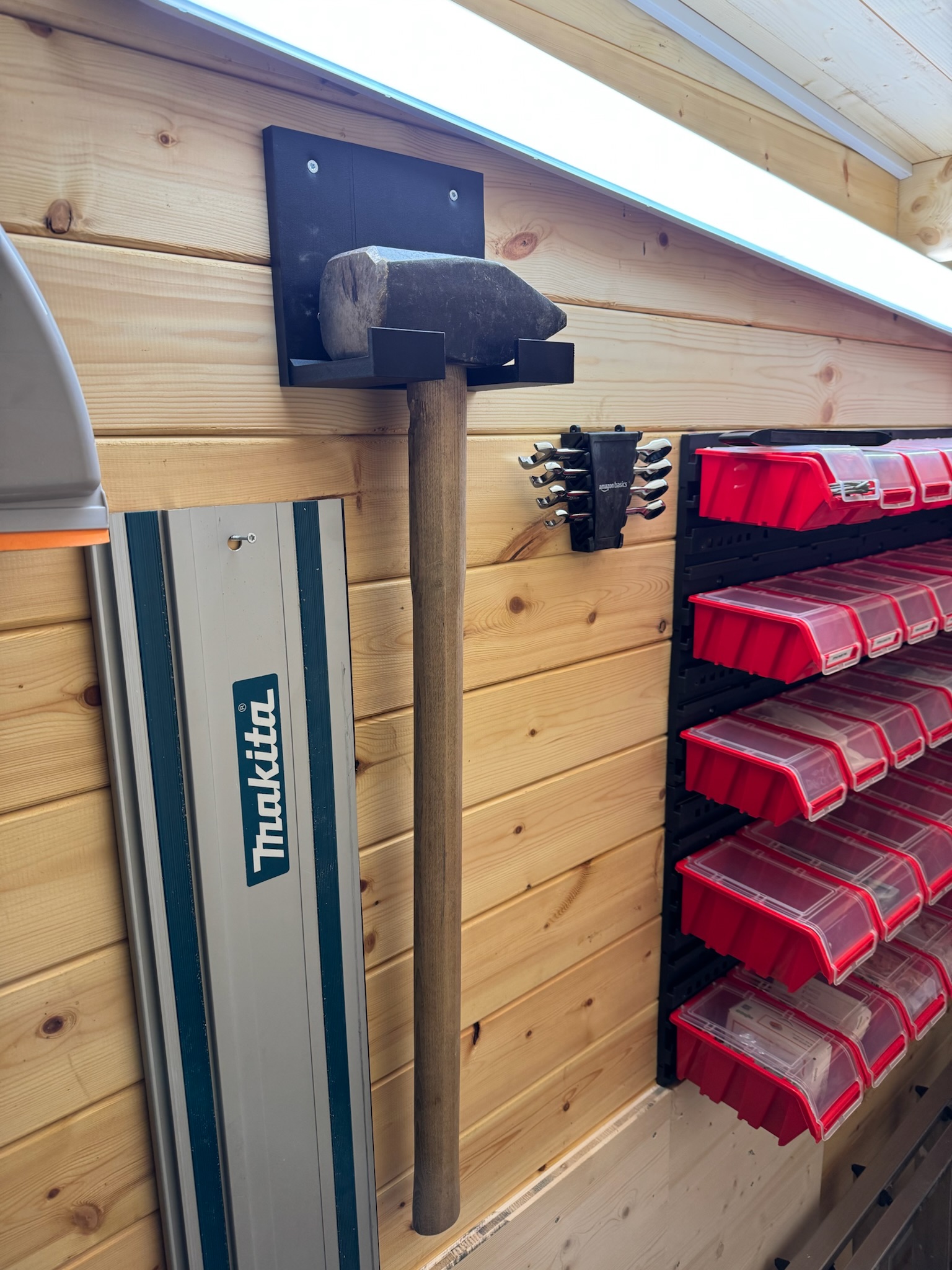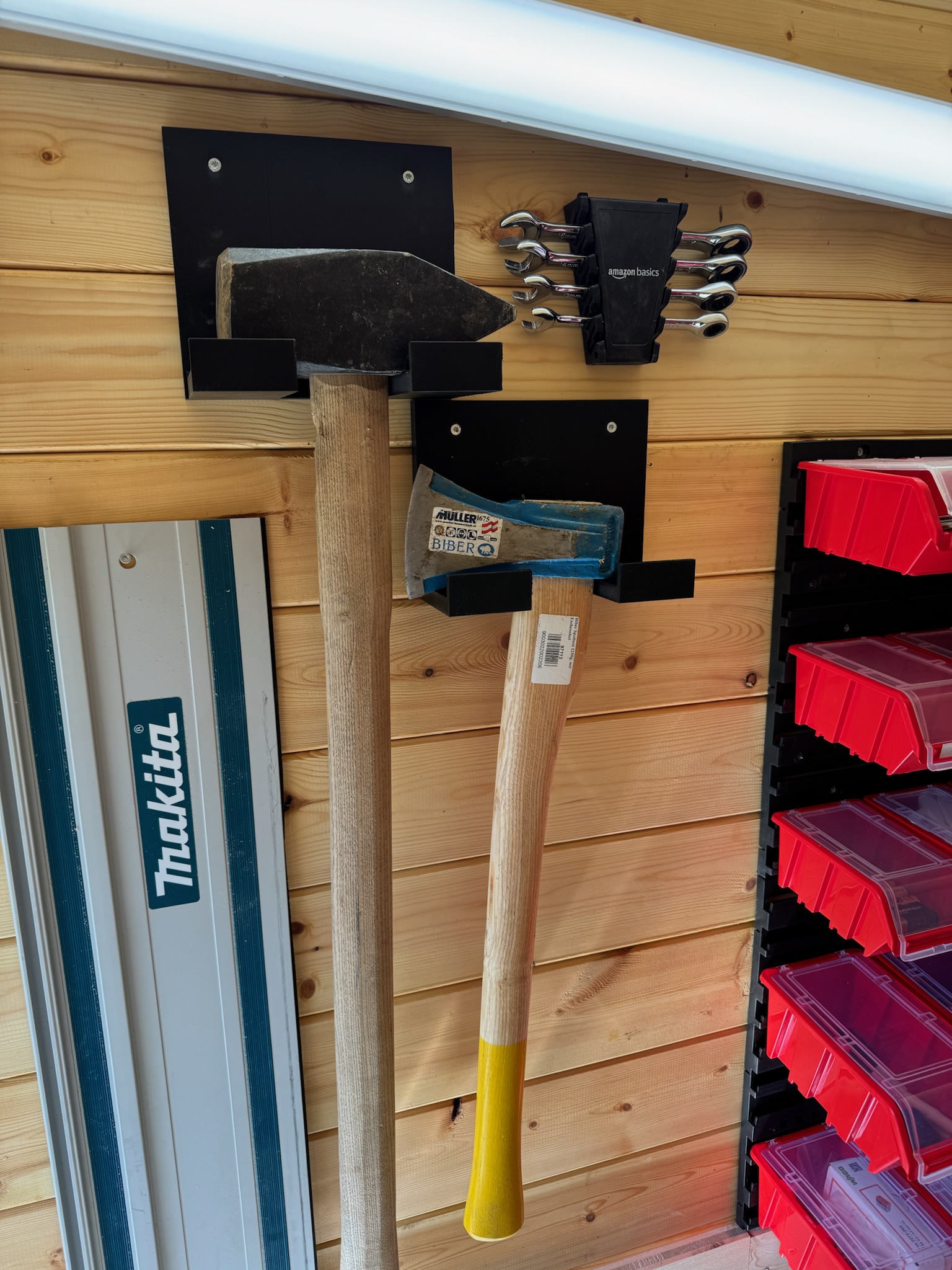 Drills, saws, a slowly filling wall of clamps.